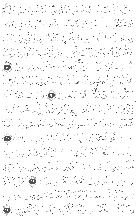 Section 2 [Tehreem 66:8] O People who Believe! Incline towards Allah in a repentance that becomes a guidance for the future; it is likely that your Lord will relieve you of your sins and admit you into Gardens beneath which rivers flow - on the day when Allah will not humble the Prophet and the believers along with him; their light will be running ahead of them and on their right; they will say, �Our Lord! Perfect our light for us, and forgive us; indeed You are Able to do all things.� [Tehreem 66:9] O dear Prophet (Mohammed � peace and blessings be upon him), wage holy war against the disbelievers and the hypocrites, and be strict with them; and their destination is hell; and what a wretched outcome! [Tehreem 66:10] Allah illustrates the example of the disbelievers - the wife of Nooh and the wife of Lut; they were bonded in marriage to two of Our bondmen deserving Our proximity � they then betrayed them so they did not benefit them the least against Allah and it was declared, �Both of you women enter the fire, along with others who enter.� [Tehreem 66:11] And Allah illustrates an example of the Muslims - the wife of Firaun; when she prayed, �My Lord! Build a house for me near You, in Paradise, and deliver me from Firaun and his works, and rescue me from the unjust people.� [Tehreem 66:12] And the example of Maryam the daughter