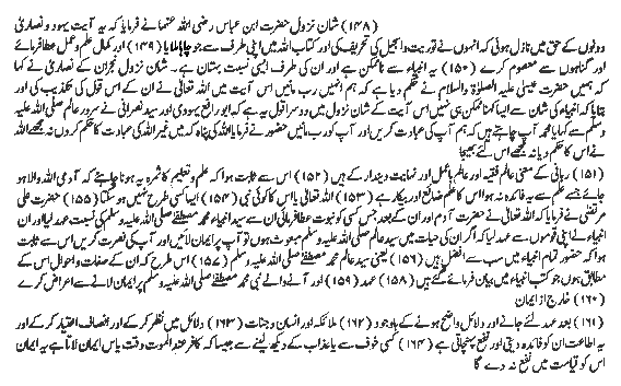 | اور یاد کرو جب اللہ نے پیغمبروں سے ان کا عہد لیا جو میں تم کو کتاب اور حکمت دوں پھر تشریف لائے تمہارے پاس وہ رسول کہ تمہاری کتابوں کی تصدیق فرمائے تو تم ضرور ضرور اس پر ایمان لانا اور ضرور ضرور اس کی مدد کرنا، فرمایا کیوں تم نے اقرار کیا اور اس پر میرا بھاری ذمہ لیا؟ سب نے عرض کی، ہم نے اقرار کیا، فرمایا تو ایک دوسرے پر گواہ ہوجاؤ اور میں آپ تمہارے ساتھ گواہوں میں ہوں | ۸۱ |